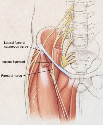 Most entrapment neuropathies occur below the inguinal ligament. After passing beneath the inguinal ligament, the femoral nerve is in close proximity to the femoral head, the tendon insertion of the vastus intermedius, the psoas tendon, the hip, and the joint capsule. The femoral nerve does not have significant protection in this area.