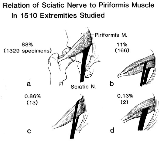 In 15-30% of the population the sciatic nerve passes through the piriformis muscle rather than underneath it. These people have been reported by some studies to have a greater incidence of piriformis syndrome than does the general population.